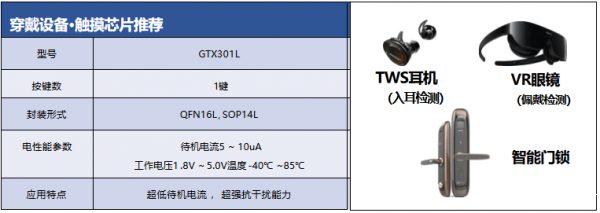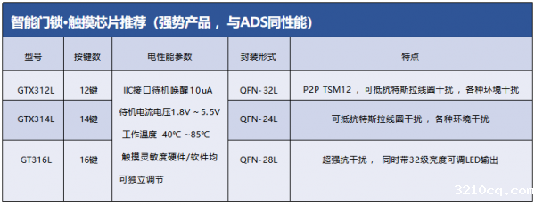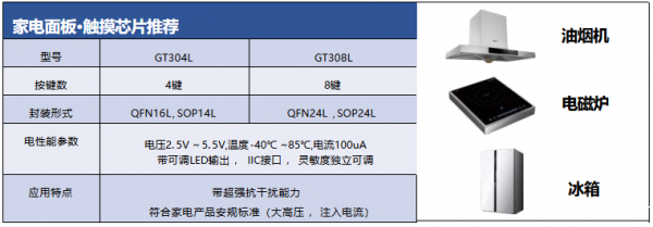 共8款型号:GT301L、GT304L、GT308L、GTCO8L、GTX301L、GTX312L、GTX314L、GT316L分别对应1、4、8、12、14、16通道;适合于多种形式的触摸按键控制,支持多点触控。