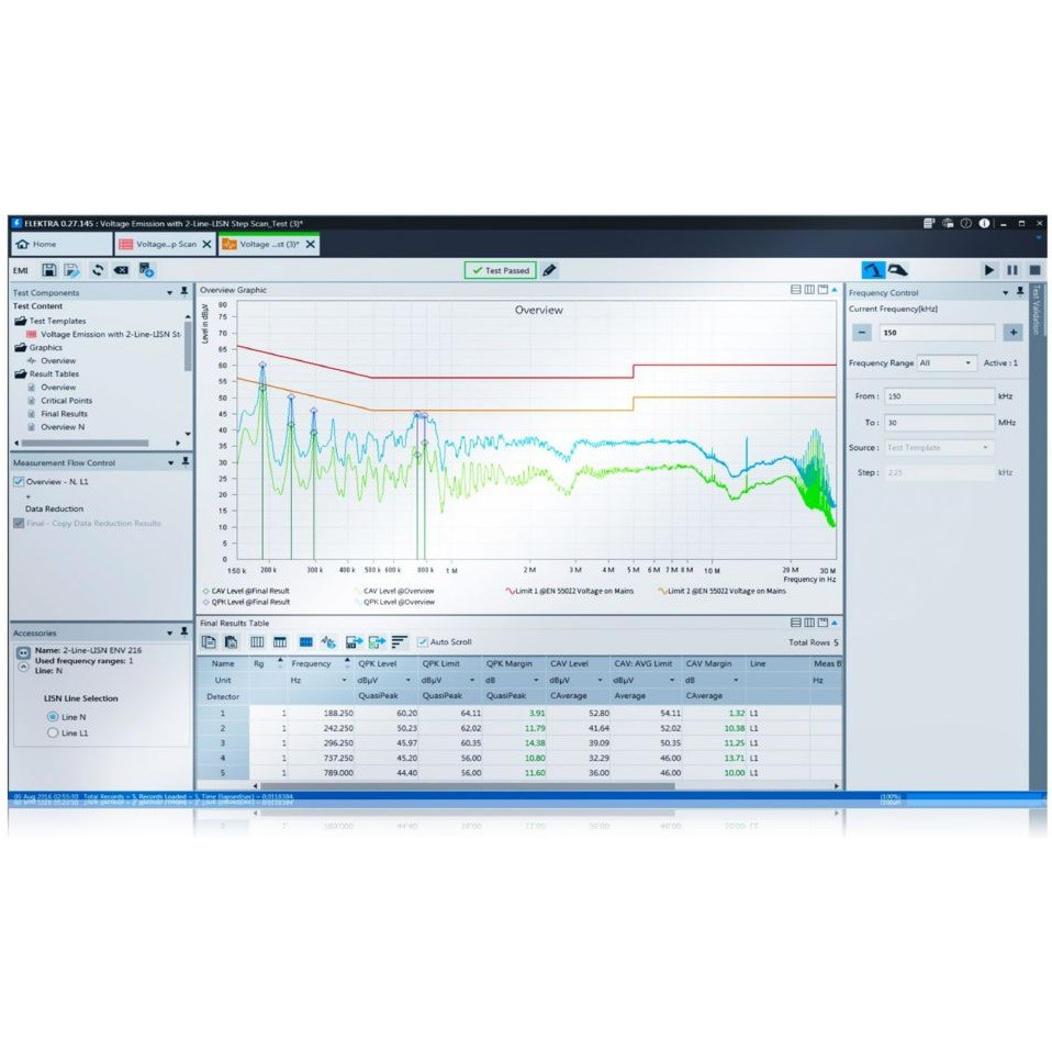 R&S®ELEKTRA 测试软件控制完整的 EMC 测试系统,自动进行被测设备 (EUT) 的骚扰 (EMI) 和抗扰度 (EMS) 认证测试。R&S®ELEKTRA 根据通用标准简化测试系统配置和测试描述。它可加快执行测试,并迅速生成全面的测试报告。