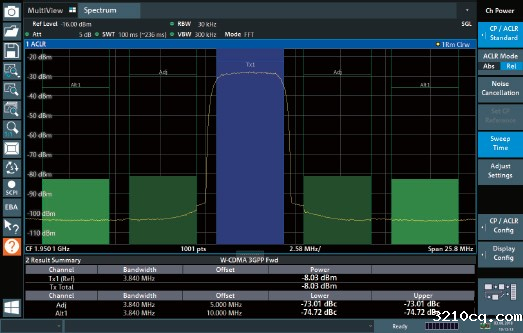 邻道泄漏比 (ACLR) 测量需要高动态范围,可使用信号与频谱分析仪执行