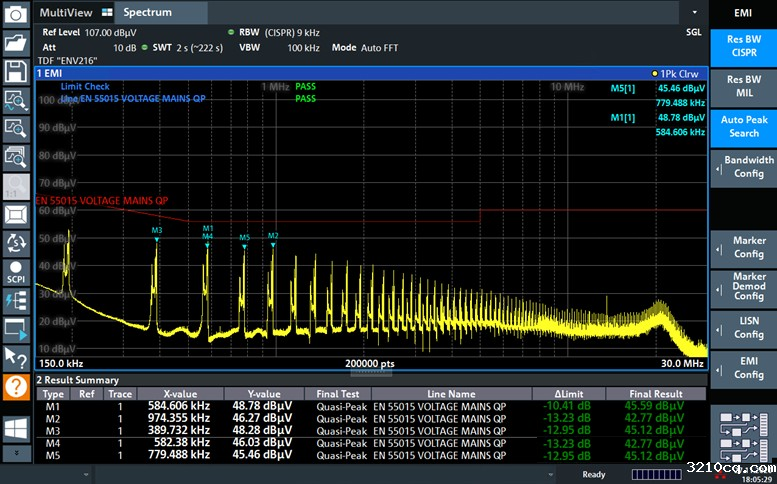 电磁干扰 (EMI) 方面同样需要确保一致性。相应的EMI标准要求使用适当的 EMI 检测器 (准峰值、CISPR-Average和MS-Average (CISPR-RMS)) 测量最低数量的杂散。信号与频谱分析仪可进行对应的预一致性测量。