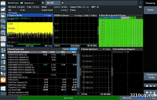 对5G NR信号进行信号分析。测量应用将显示EVM、功率谱和星座图等关键参数。