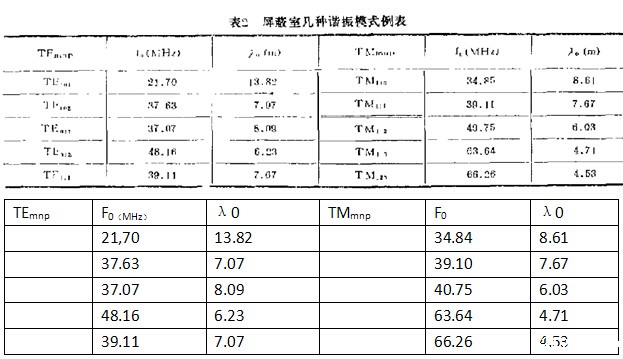 表2列举了通过公式2计算的屏蔽室内几个低次模的谐振频率。