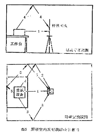 图5中矢径1为直射波,矢径2、3、4为经过壁面的一次反射波,矢径5为二次反射波。由于屏蔽室内接收天线处的电磁场是直射波与各种反射波的合成场,而开阔场地上的天线主要接收来自受试设备的直接辐射以及地面的反射。因此,与开阔场地相比,在屏蔽室测量会产生一定的误差。