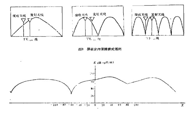 为了获得实际使用的屏屏蔽谐振频率f0,可采用试验手进行探索。具体方法是:将信号源及发射天线放在门外,接收天线放在屏蔽室内,选定天线高度及位置,将接收机输入端与接收天线相连,信号源输出端与发射天线相连,把屏蔽室门一小缝,以便于信号耦合到屏蔽室,在室内产生电磁场。
