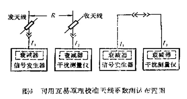 将一对完全相同的双锥天线置于测试现场,选定好天线间距,一般取1m、3m、10m。两天线的架设高度和极化方向均一致。天线高度在1~4m内调整。收发天线经电缆l1、l2分别接到信号源阻抗为和场强测量仪上。
