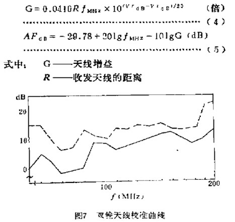 图7说明,测试天线架高2m,距离1m。在开阔场地测量时,天线周围3m距离范围之内无障碍物,在屏蔽到内测量时,天线置于屏蔽室的几何中心利用(4)(5)两式即可给出天线校准系数的频响关系曲线。图7给出了双锥天线在开阔场与屏蔽室内的校准曲线。从上图中我们发现,在30~200MHz范围内,双锥天线在开阔场与屏蔽室内的校准曲线具有大致相同的趋势。由于屏蔽室内存在反射现象,因而天线系数明显高于自由空间开阔场的校准系数。