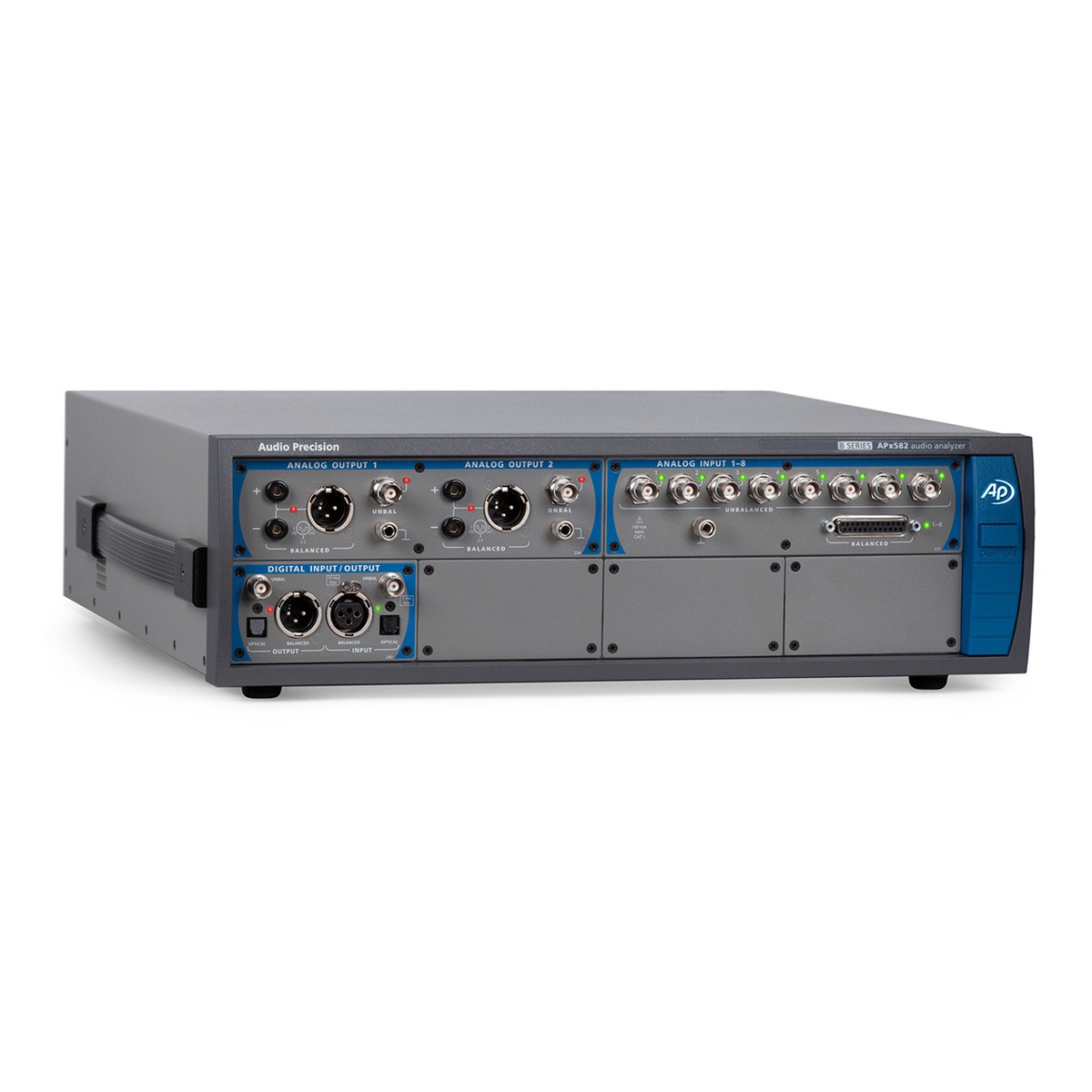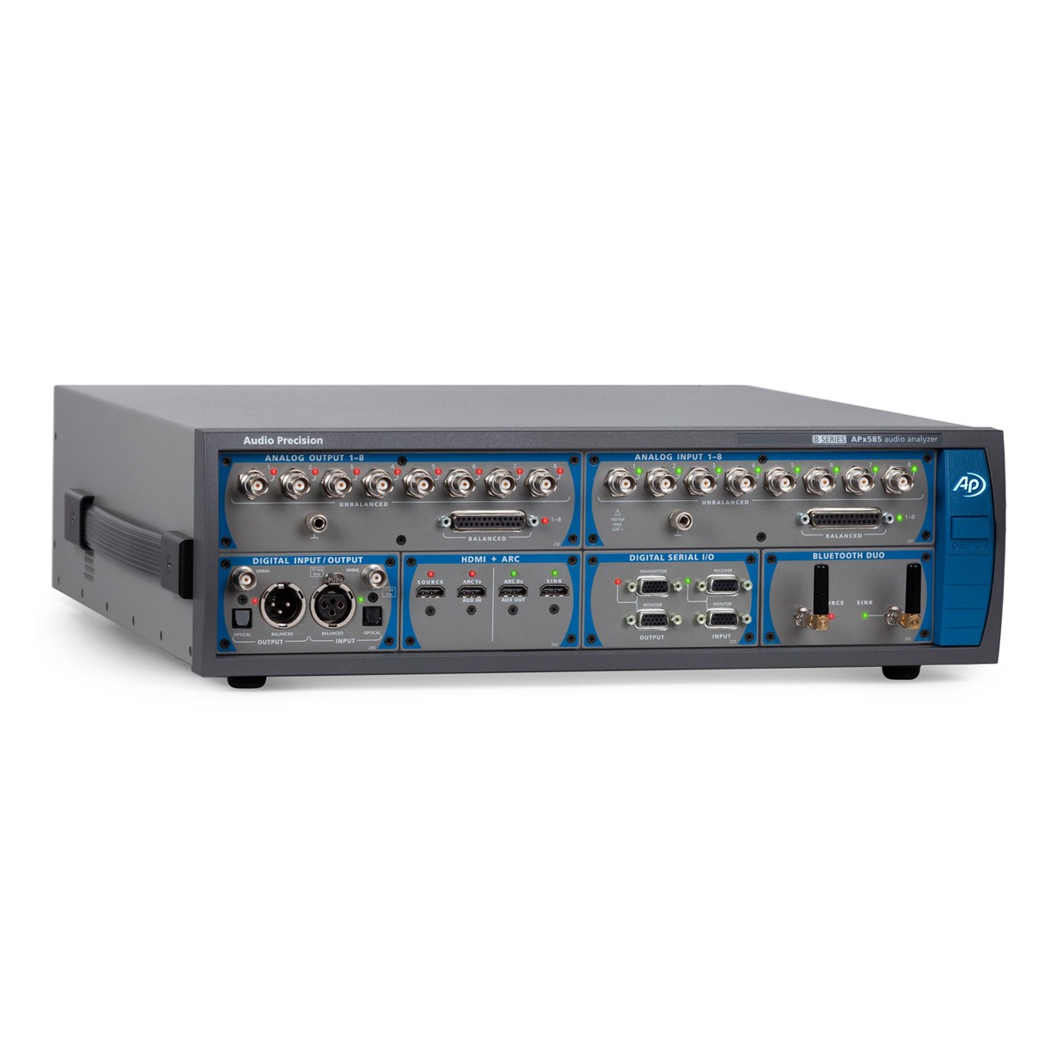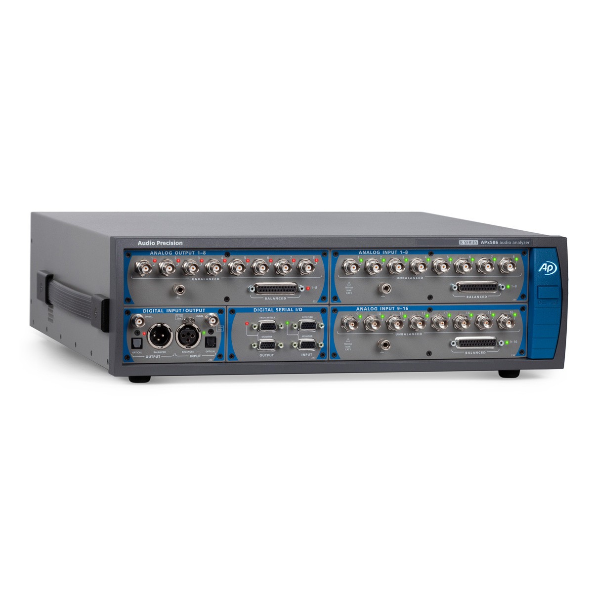所有的APx58x B系列分析仪有了216k数字输入和输出通过AES/EBU,TOSLINK和SPDIF。此外,I/O可以扩展可选的数字串行,HDMI与ARC,PDM和蓝牙模块。最后,选择先进的主时钟(AMC)模块处理输入和输出的时钟信号同步与外部设备的APx58x B系列(或反之亦然),和AMC也使抖动产生和分析(与先进的数字,数字串行或PDM模块连接)。