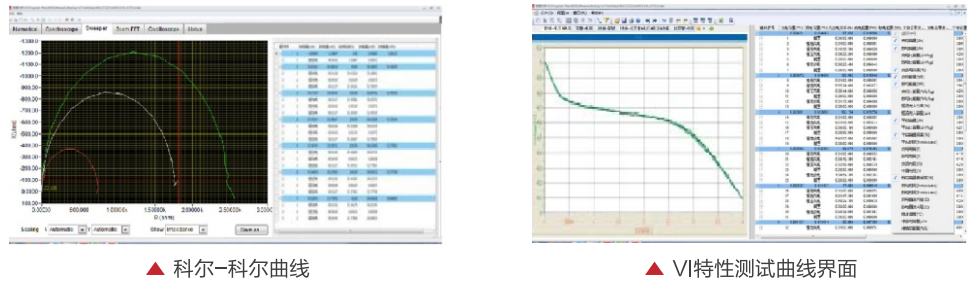 使用专用上位机软件,可进行I-V特性测试、恒电流特性测试、交流断路测试、交流阻抗扫描测试、测试出I-V特性曲线,科尔-科尔曲线等数据。软件界面类Office界面风格,各通道独立显示,支持电压电流波形绘制,可以表格形式显示结果等诸多元素,使得这款专业软件在具备强大测试功能同时,兼具美观易用优点。