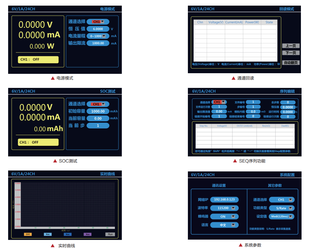 N83624系列为一款小功率、多通道、高精度可编程电池模拟器,也是一款高精度多通道直流电源,电压精度高达0.6mV,支持μA级电流测量,单机多达24个通道,且通道间相互隔离,方便多通道串联使用。N83624系列支持本地/远程(LAN/RS232)控制,通讯响应时间<10ms,支持电源模式、充电模式、SOC测试、序列测试、实时曲线等多种测试功能。N83624系列编程软件灵活易用、操作简洁,能满足多通道、多参数、复杂测试环境下测试的需求。