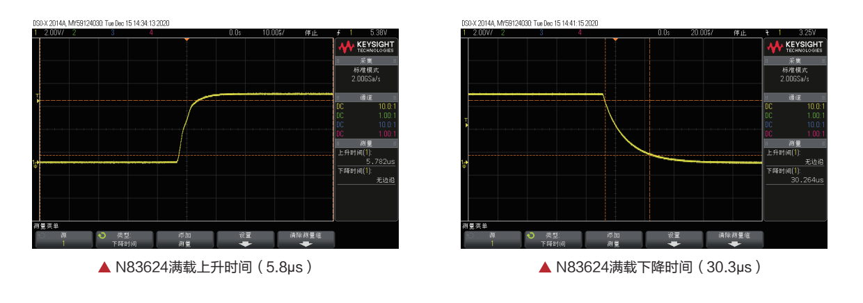 N83624系列具有快速的动态响应能力,10%负载-90%负载,恢复到原电压减50mV以内的时间<100us,保证电压或电流的上升波形高速且无过冲,为待测物提供了稳定的供电,符合对电源要求苛刻的产品测试要求。