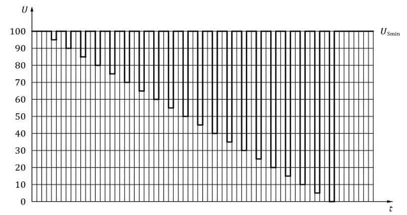 供电电压以5%步长从USmin降到0.95USmin,保持5s,再上升到USmin,至少保持10s并进行功能试验。然后将电压降至0.9USmin等等,按图6所示以USmin的5%梯度继续进行直到降到0V,然后再将电压升到USmin。