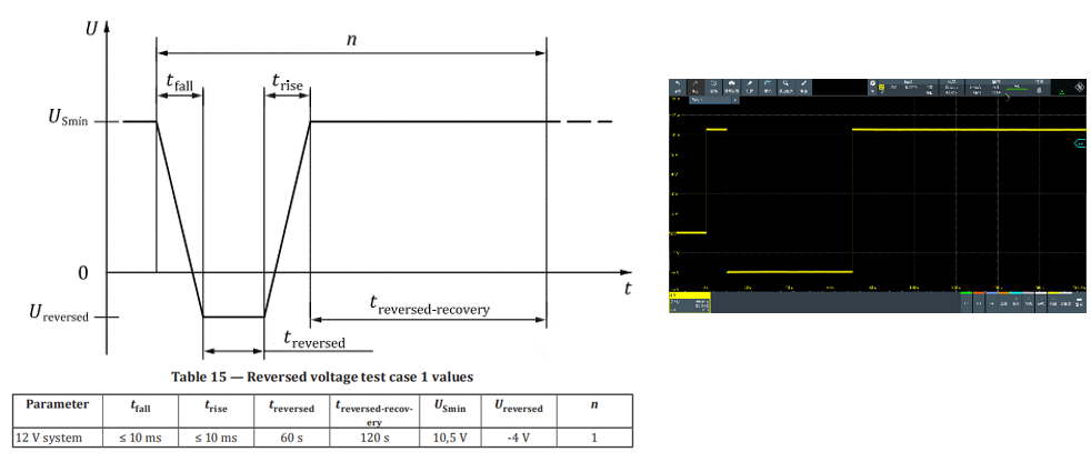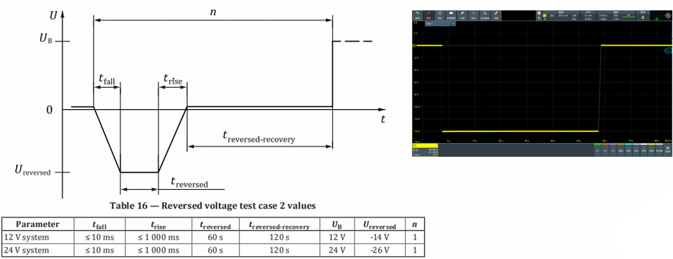 12V系统反向电压为-14V,从0V通过tfall ≤10ms下降至-14V,保持60s后通过trise ≤1000ms从-14V上升至0V,保持120s。