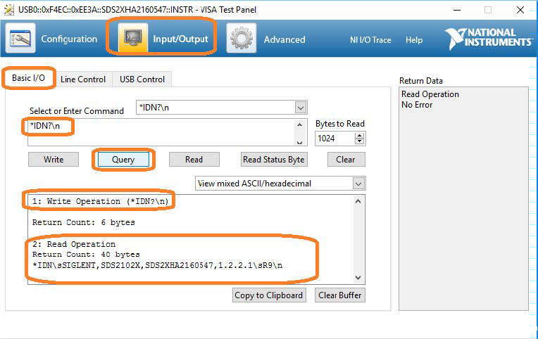 9)VISA测试面板中另一个有用的项目是输入/输出功能。 此模式允许您发送特定仪器命令和接收仪器响应。