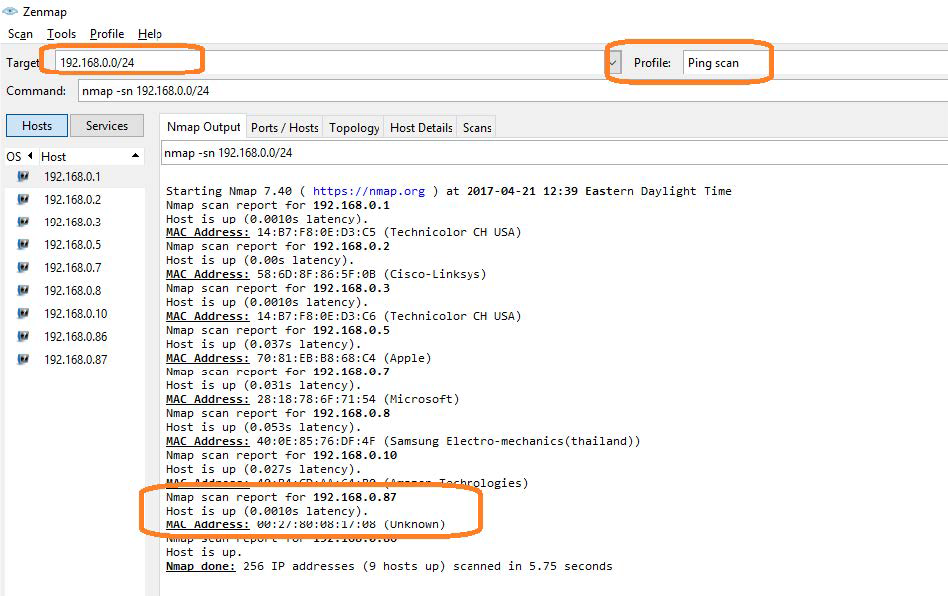 在这里,我们正在执行Ping(短扫描以识别正在使用的IP地址)