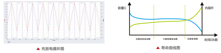 N8130可通过重复充放电循环测试,测量超级电容在充放电过程中表征寿命特征的各项物理参数并提取其衰减曲线。通过分析参数衰减曲线,用户可获取超级电容在不同应用环境下的预计寿命、充放电周期以及在不同阶段的性能指标。寿命测试结果可用于指导材料、工艺、存储等诸多环节的改善。