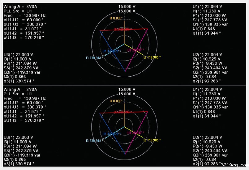 PA5000H功率分析仪可同时测量并显示变频器输入三相与输出三相的矢量图,可对输入、输出各相间的相角关系进行分析,准确评估出输入信号对输出信号的角差影响。(所有型号均能满足)