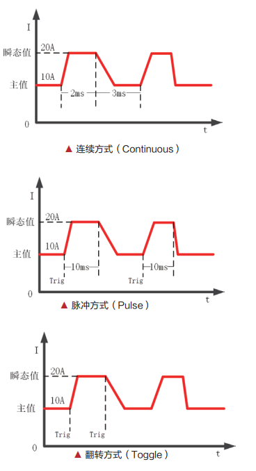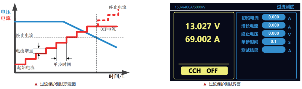 负载提供上升斜坡电流用来测试被测设备电压是否能达到终止电位,以判别OCP 保护是否正常。此测试检查过载情况下的被测设备输出响应。