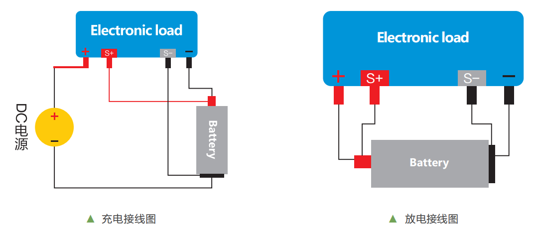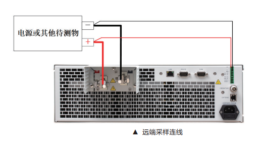 远端采样又名为四线法采样。负载工作时,输入电流会在连接导线和端口与导线的接触电阻上产生一定压降,这将影响负载的电压测量准确度。当负载工作在CV、CR 和CP 功能且需要精确测量时,建议使用远端采样方式。远端采样时,端子S+和S-直接连接到被测设备的输出端,消除了连接导线上的压降,从而得到较高的测量准确度。