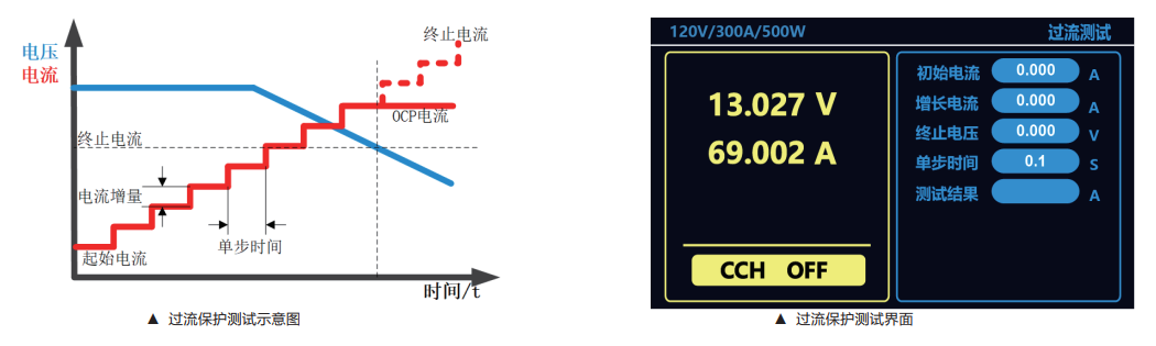 提供上升斜坡电流用来测试被测设备电压是否能达到终止电位,以判别 OCP 保护是否正常。此测试检查过载情况下的被测设备输出响应。