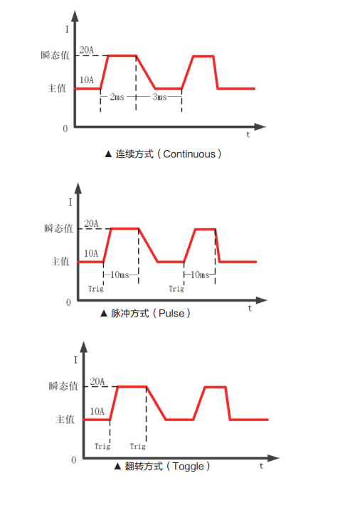 手动模式:短路键按下时负载短路,松开时停止短路。手动模式适合调试或研发应用,避免因误操作导致测量事故;