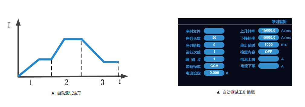自动测试功能用于模拟真实带载波形,并提供高效的规格检查流程,可显著提高测试效率。该功能需要调用序列文件进行测试,用户最多可以编辑 100 个序列测试文件,每个测试文件可支持 50 个测试步骤。每个测试步骤中,用户可设置带载模式、带载主值、上升斜率、下降斜率、单步时间和检查内容。