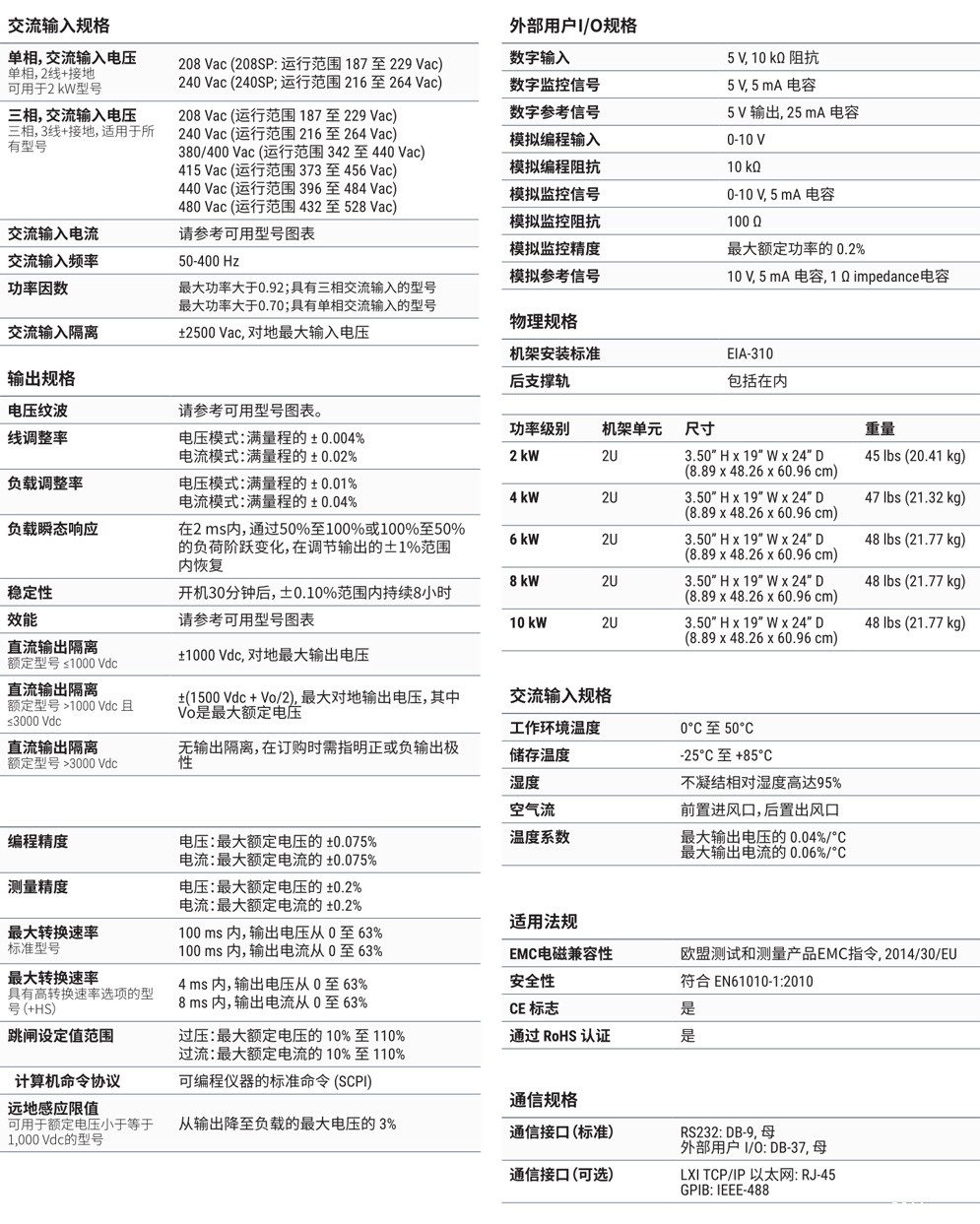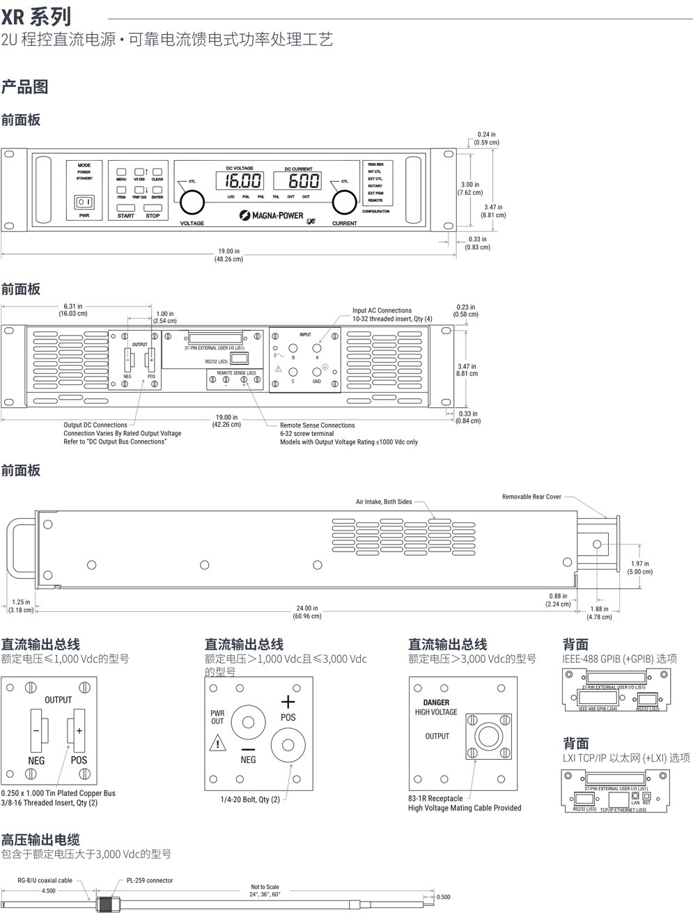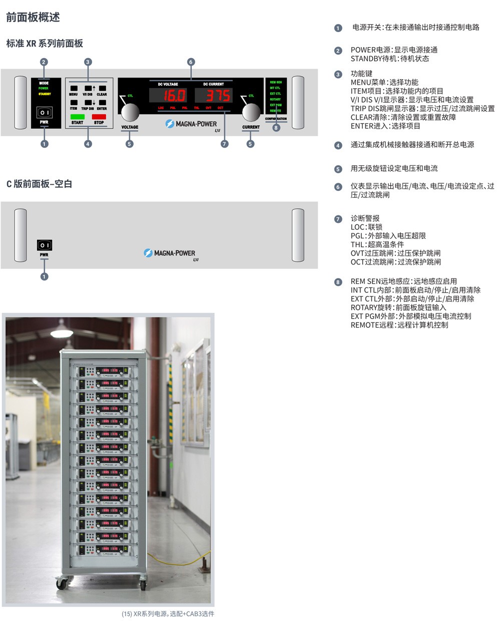 XR系列的设计旨在实现可靠性高,功率密度行业领先的2U(3.5英寸高)机架式程控电源的各种功率等级产品,包括:2 kW、4 kW、6 kW、8 kW以及10 kW。XR系列的特点在于实现了麦格纳电子设备公司产品中最大的电压范围(5Vdc至10,000Vdc),并使用了标志性的电流馈电式功率处理来提供强劲的功率转换能