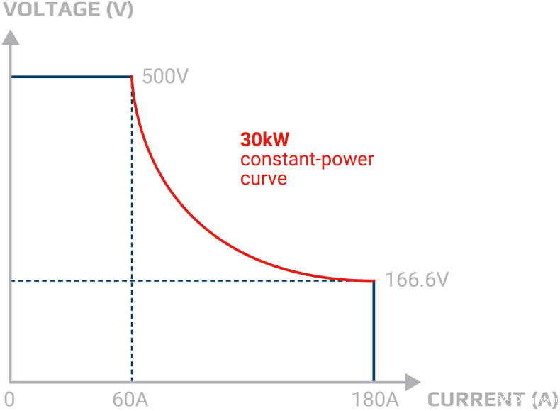 所有EA直流电源均具有宽范围功能,可在更大范围内提供全部功率,仅用一台电源即可测试更多设备。 宽范围使电源在较小电流时自动调整为高电压,而在电压较低时调整输出大电流。 EA的宽范围功能可在满功率输出至33%的额定输出电压之间调整。