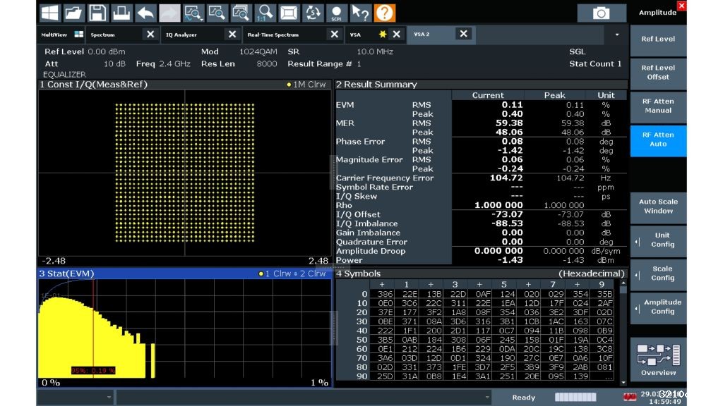 R&S®FSW-K70 矢量信号分析选件可帮助用户灵活分析精确到比特级的数字调制单载波。尽管分析工具数目繁多,但结构清晰的操作理念可以很好地简化测量。R&S®FSW-K70M 可以分析采用两种不同调制方案的信号,例如 DVB-S2X 信号。R&S®FSW-K70P 扩展选件可以测量 PRBS 数据(包括 PRBS23)的原始误码率 (BER)。