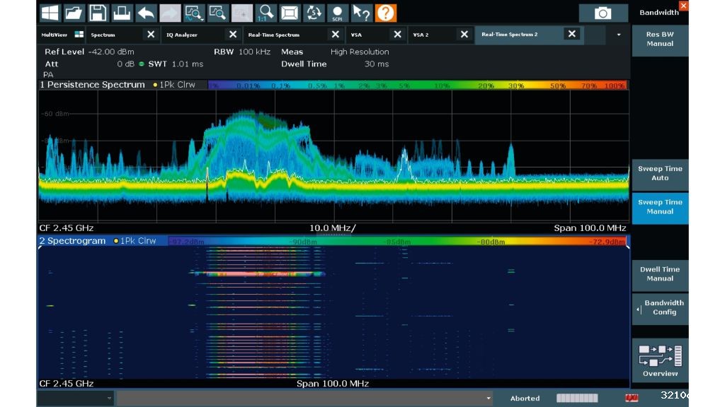 用户可以使用 R&S®FSW 实时选件在高达 800 MHz 的带宽中可靠检测纳秒级极短偶发干扰信号,即使接近强力载波时也同样如此。实时频谱分析有助于用户分析现有跳频算法并创建替代算法,以防止相同频段内符合不同标准的信号之间发生冲突。