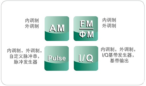 标配调幅,调频,调相等模拟调制方式以及脉冲调制和脉冲发生器,可选可用户自定义的脉冲序列,以及I/Q调制和IQ基带发生器,可生成QAM、ASK、PSK、FSK、MSK等各种常用的调制信号;所有调制都支持内部和外部调制源。